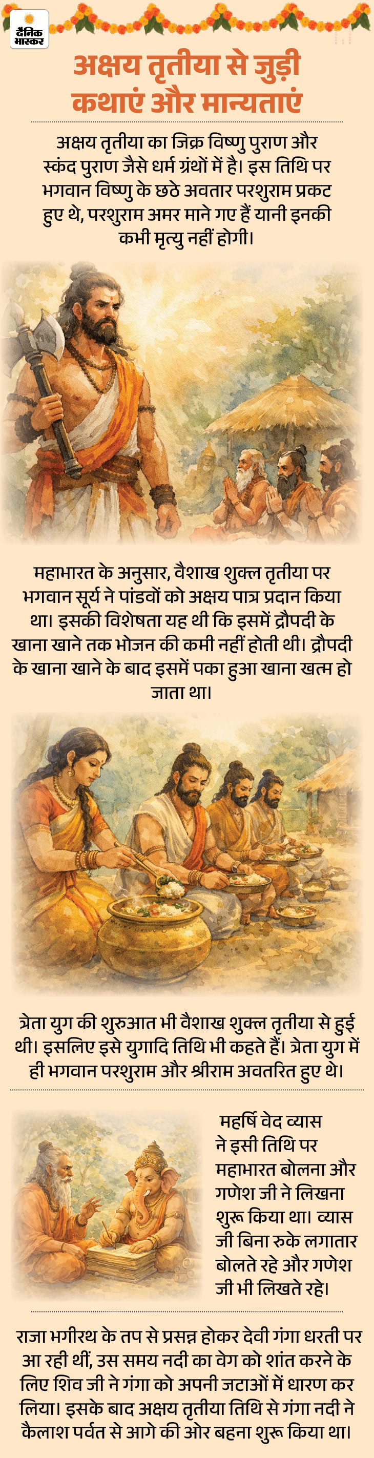 आज (20 अप्रैल) अक्षय तृतीया है। इसे अबूझ मुहूर्त माना जाता है यानी आज बिना मुहूर्त देखे ही शादी, गृह प्रवेश, मुंडन, जनेऊ जैसे शुभ काम किए जा सकते हैं। इस तिथि पर भगवान परशुराम का प्रकट उत्सव भी मनाते हैं। परशुराम अजर-अमर यानी अक्षय माने गए हैं। अक्षय का अर्थ है- जिसका कभी क्षय न हो यानी जो हमेशा रहने वाला हो, जो कभी खत्म नहीं होगा। इनकी जन्मतिथि होने की वजह से ही वैशाख शुक्ल तृतीया को अक्षय नाम मिला है।