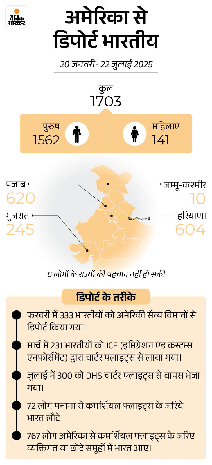 अमेरिका ने साल 2025 में शुरुआती 7 महीने में अबतक 1703 भारतीय नागरिकों को भारत डिपार्ट किया है। इनमें 1562 पुरुष और 141 महिलाएं शामिल हैं। विदेश राज्य मंत्री कीर्ति वर्धन सिंह ने लोकसभा में लिखित उत्तर में ये जानकारी दी।