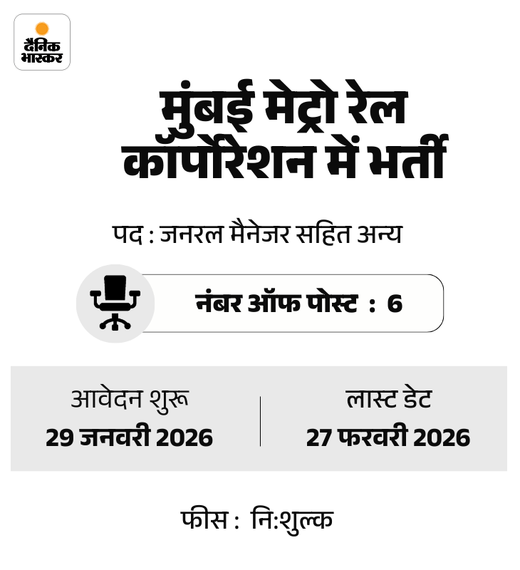 मुंबई मेट्रो रेल कॉर्पोरेशन लिमिटेड (MMRCL) ने जनरल मैनेजर, जूनियर इंजीनियर सहित 6 पदों पर भर्ती निकाली है। उम्मीदवार मुंबई मेट्रो की ऑफिशियल वेबसाइट mmrcl.com पर जाकर आवेदन कर सकते हैं।