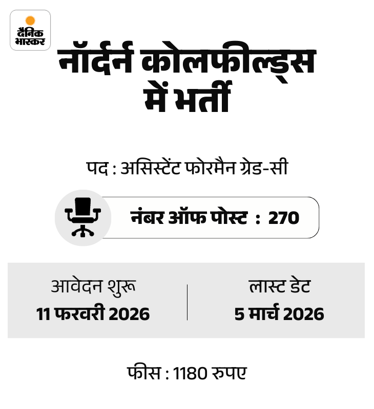 आज की सरकारी नौकरी में जानकारी नॉर्दर्न कोलफील्ड्स लिमिटेड में 270 पदों पर भर्ती का नोटिफिकेशन जारी होने की। इस भर्ती के लिए आवेदन की शुरुआत कल यानी 11 फरवरी 2026 से हो रही है। बैंक ऑफ बड़ौदा में 166 पदों पर भर्ती की। साथ ही मुंबई मेट्रो रेल कॉर्पोरेशन में इंजीनियर की 6 वैकेंसी की।