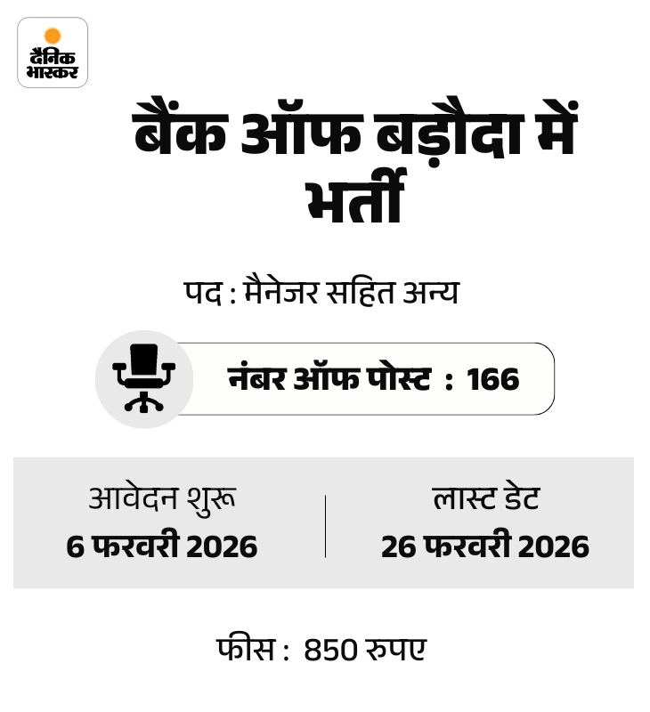 बैंक ऑफ बड़ौदा ने मैनेजर सहित 166 पदों पर भर्ती निकाली है। उम्मीदवार बैंक की ऑफिशियल वेबसाइट bankofbaroda.in पर जाकर आवेदन कर सकते हैं।