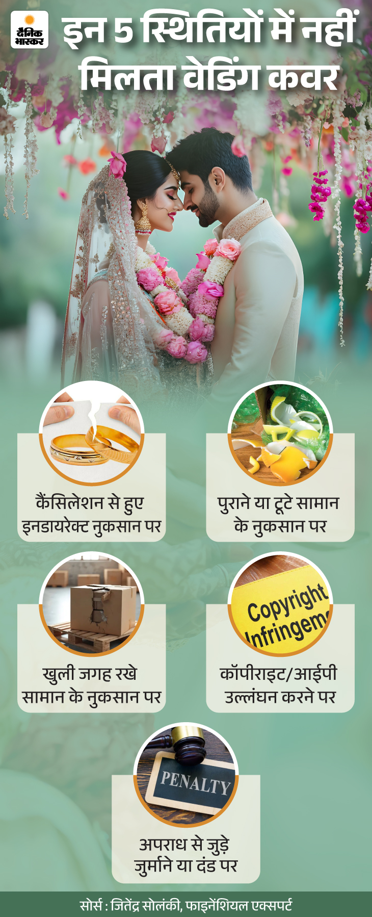 जवाब- वेडिंग इंश्योरेंस में कुछ मामलों में कवर नहीं मिलता है। आइए इसे ग्राफिक के जरिए समझते हैं।