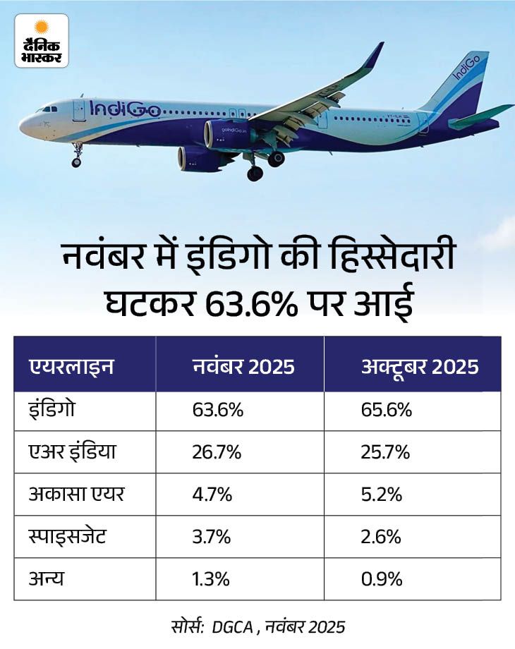 एविएशन रेगुलेटर डीजीसीए (DGCA) की तरफ से जारी ताजा आंकड़ों के मुताबिक, नवंबर में इंडिगो की घरेलू बाजार हिस्सेदारी गिरकर 63.6% रह गई है। अक्टूबर में यह 65.6% थी।