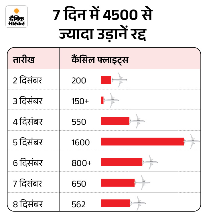 बीते 8 दिनों में (2 से 9 दिसंबर तक) इंडिगो की देशभर में करीब 5000 उड़ानें रद्द हुईं हैं।