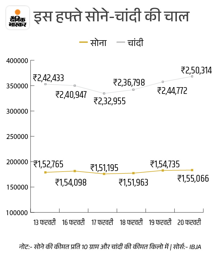 इस हफ्ते सोने-चांदी के दाम में बढ़त रही। सोना 2,300 रुपए बढ़कर 1.55 लाख रुपए प्रति 10 ग्राम पर पहुंच गया है। इससे पहले ये बीते हफ्ते यानी 13 फरवरी, शुक्रवार को 1,53 लाख रुपए पर था। वहीं चांदी 2.42 लाख किलो से बढ़कर 2.50 लाख रुपए पर पहुंच गई है। यानी इसकी कीमत 8,000 रुपए बढ़ी है।