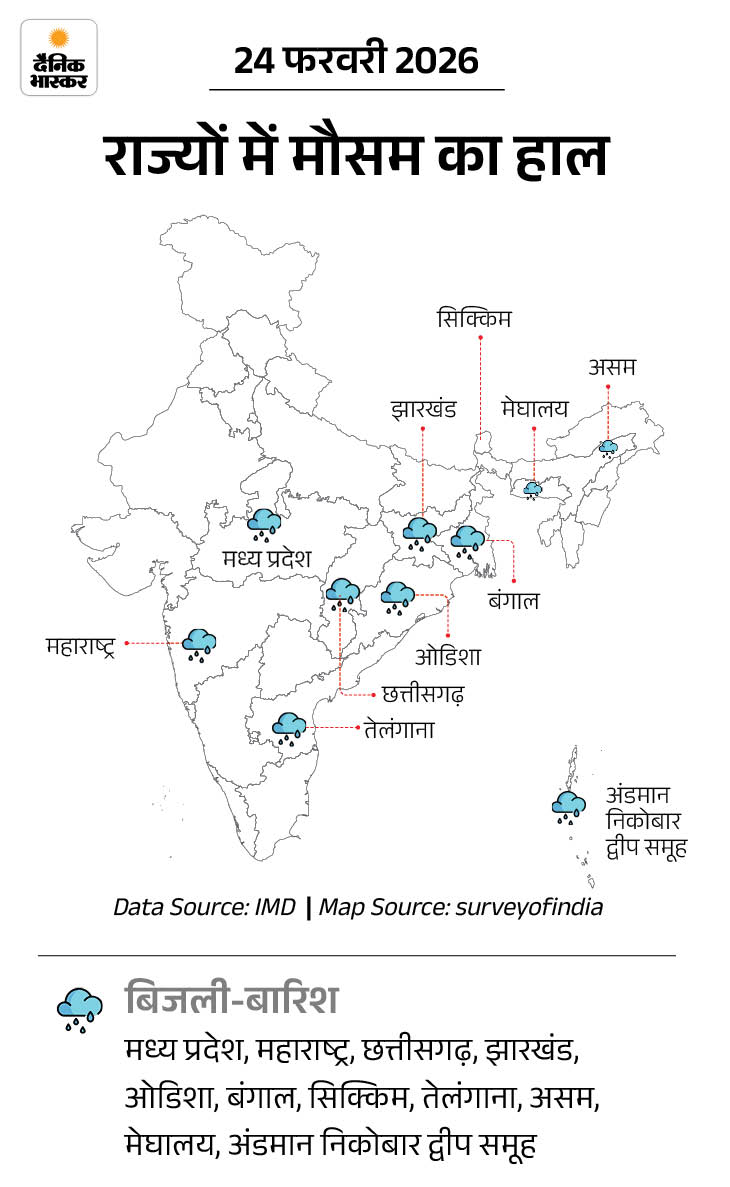 मध्य प्रदेश और छत्तीसगढ़ में बारिश के साथ ओले गिरे। एमपी के शिवपुरी में ओले गिरे, साथ में बारिश भी हुई। छत्तीसगढ़ के रायपुर और बिलासपुर में सुबह से बदली छाई रही फिर दोपहर में रिमझिम बारिश हुई। वाड्रफनगर सहित आसपास के इलाकों में ओलावृष्टि भी हुई। हरियाणा में भी बारिश हुई।