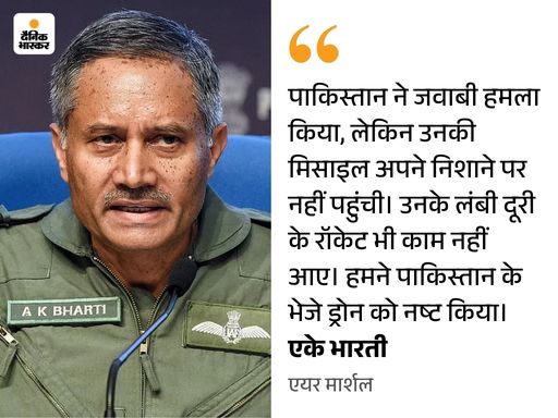 एयर मार्शल एके भारती- ‘हमारी लड़ाई आतंकवाद और आतंकवादियों के साथ थी, 7 मई को हमने सिर्फ आतंकवादियों पर हमला किया। पाकिस्तानी सेना ने आतंकवादियों का साथ दिया और हमें जवाब देना पड़ा। उन्हें जो नुकसान हुआ उसके लिए पाकिस्तानी सेना जिम्मेदार है।’