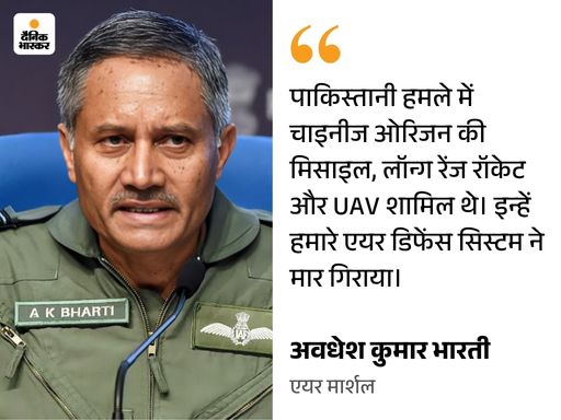 एयर मार्शल एके भारती ने बताया, ‘पाकिस्तान की तरफ से किए गए हमले में चाइनीज ओरिजन की मिसाइल शामिल थीं, इनमें लॉन्ग रेंज रॉकेट थे, uav थे, चीनी ओरिजन के कुछ कॉप्टर्स और ड्रोन थे। इन्हें हमारे एयरडिफेंस सिस्टम ने मार गिराया।’