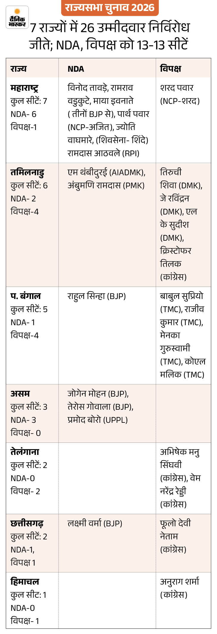 राज्यसभा चुनाव 2026- NDA ने 11 में 9 सीटें जीतीं:कांग्रेस-BJD को 1-1 सीट; हरियाणा में 5 घंटे देरी से काउंटिंग, बिहार में महागठबंधन ने 3 सीटें गंवाई