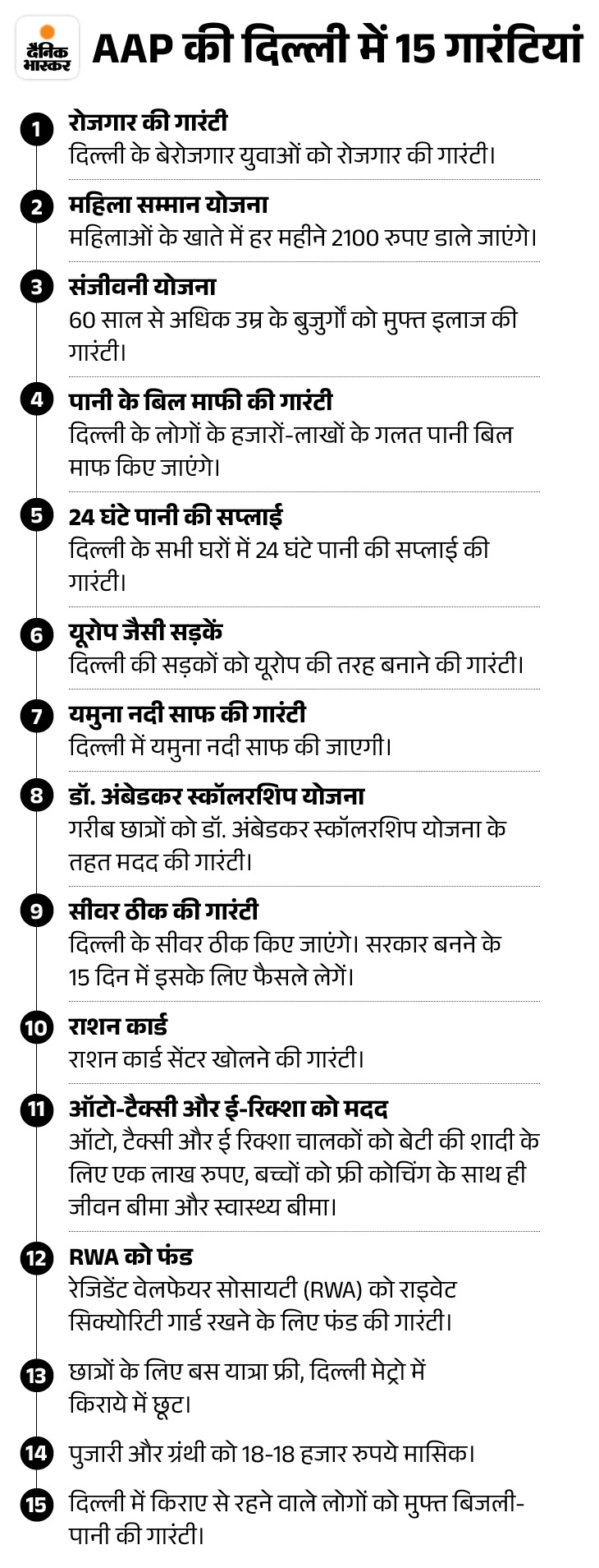 दिल्ली में 24 घंटे मुफ्त बिजली, मुफ्त पानी, मुफ्त शिक्षा, बुजुर्गों के लिए मुफ्त तीर्थ यात्रा, महिलाओं की मुफ्त बस यात्रा, अस्पतालों-मोहल्ला क्लिनिक में मुफ्त इलाज जारी रहेगा। उन्होंने कहा कि भाजपा नेताओं-प्रवक्ताओं ने भाषणों में साफ कर दिया है कि उनकी सरकार बनी तो दिल्ली में मुफ्त योजनाएं बंद होंगी।