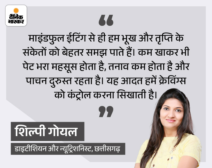 खाते समय माइंडफुल रहने से दमाग शांत होता है। नेशनल इंस्टीट्यूट ऑफ हेल्थ में पब्लिश 2021 की एक स्टडी में बिंज ईटिंग वाले लोगों पर यह थैरेपी की गई, तो एंग्जायटी 25% तक घट गई। डॉ. चेउंग की किताब ‘सेवर’ में लिखा है कि यह मेडिटेशन जैसा काम करता है।