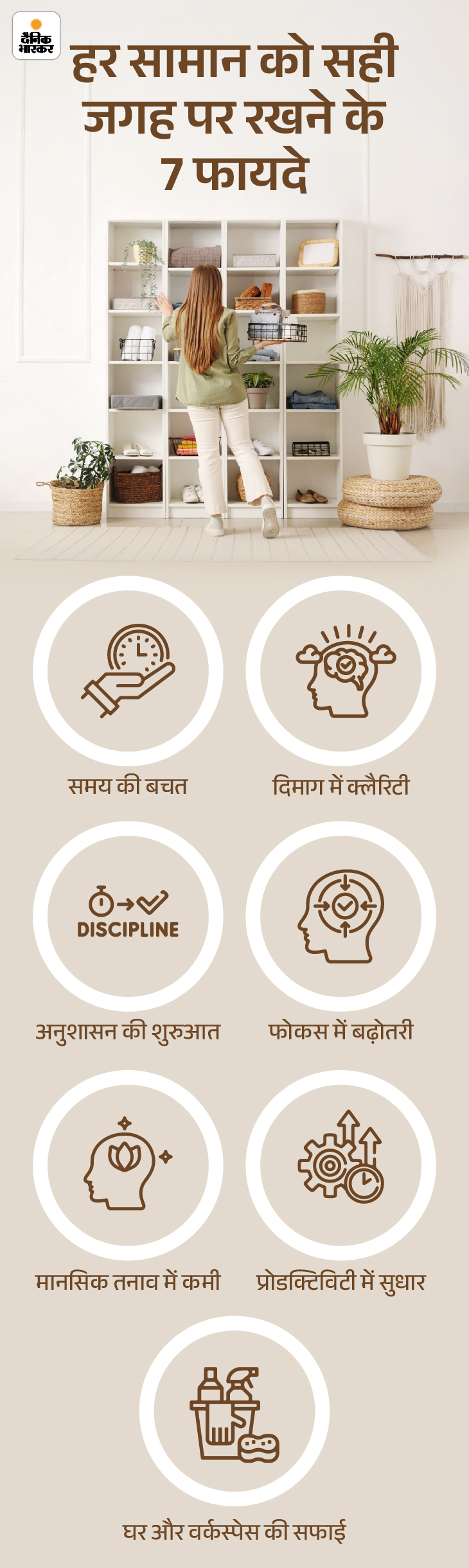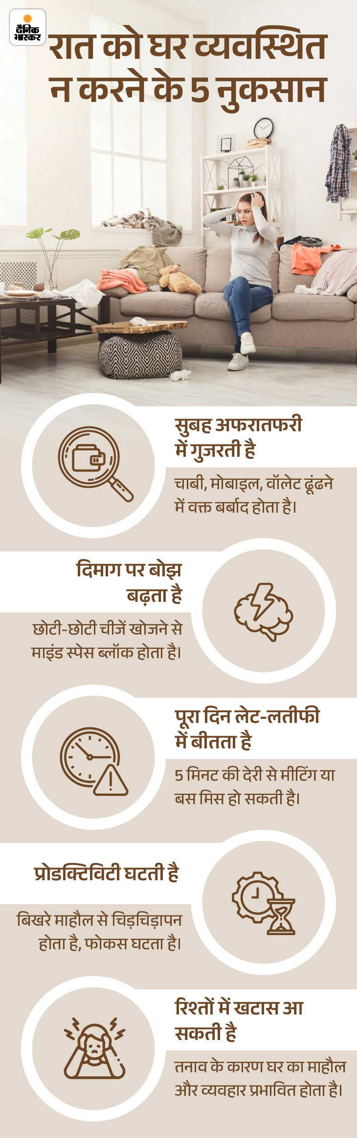 बात चाहे रिमोट की हो, चश्मे की, किताब की या टूथब्रश की, अगर हम चीजों को इस्तेमाल करने के बाद वापस उनकी जगह पर नहीं रखते हैं तो अगली बार ढूंढने में वक्त, एनर्जी और माइंड स्पेस- सब बर्बाद होता है। यही गड़बड़ी जब बार-बार होती है तो हमारे दिमाग में क्लटर बनता है और लाइफ डिसऑर्गनाइज हो जाती है।