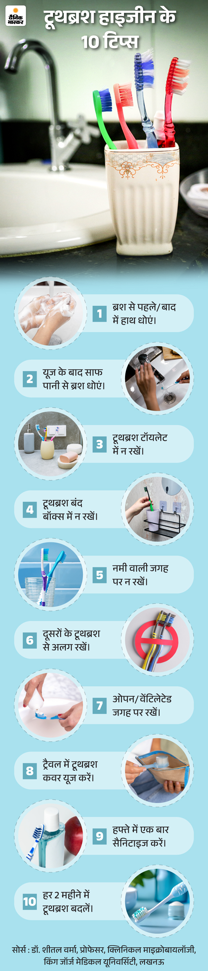 जवाब- यूएस सेंटर फॉर डिजीज कंट्रोल एंड प्रिवेंशन (CDC) की गाइडलाइन के मुताबिक, टूथब्रश हमेशा टॉयलेट से दूर और सीधा करके रखें, ताकि वह ठीक से एयर-ड्राई हो सके। गीले ब्रिसल्स में बैक्टीरिया ज्यादा समय तक जिंदा रह सकते हैं। नीचे दिए ग्राफिक से टूथब्रश हाइजीन के 10 आसान टिप्स समझिए-