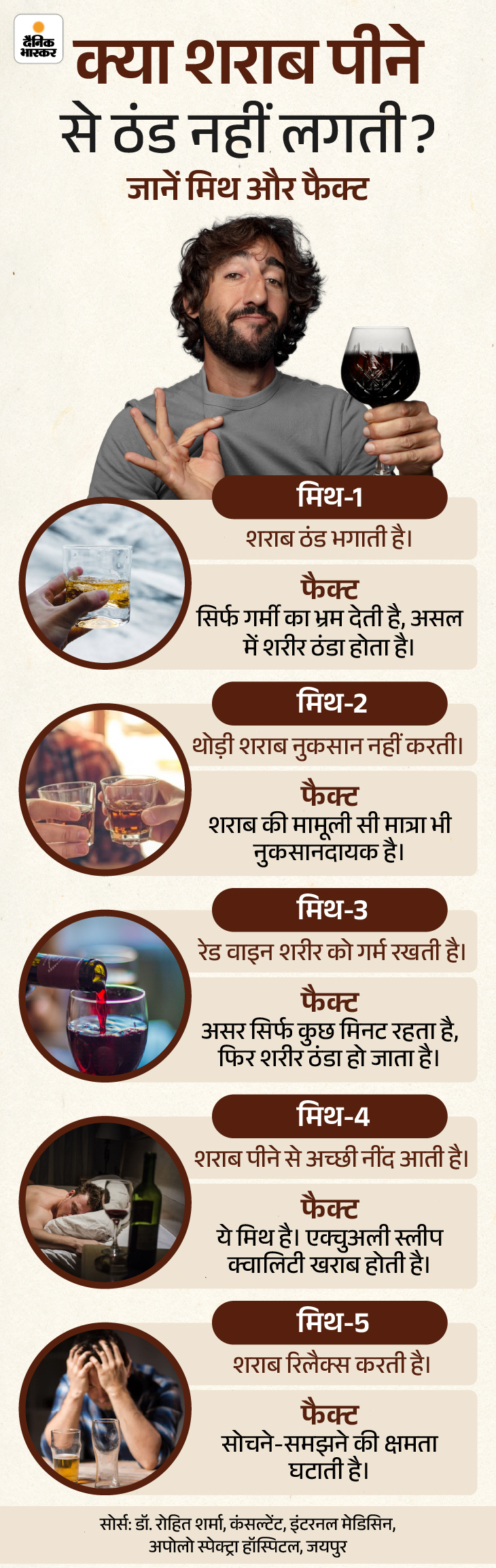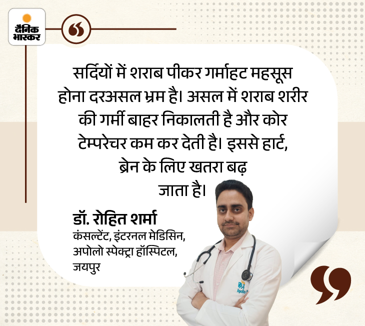 जवाब- अपोलो स्पेक्ट्रा हॉस्पिटल, जयपुर के इंटरनल मेडिसिन कंसल्टेंट डॉ. रोहित शर्मा बताते हैं कि यह मिथ सदियों पुराना है। शराब शरीर में जाने के बाद ब्लड वेसल्स को फैलाती है। इससे ब्लड स्किन की सतह तक पहुंच जाता है और गर्माहट का अहसास होता है। लेकिन इस दौरान शरीर का कोर टेम्परेचर यानी आंतरिक तापमान घटने लगता है क्योंकि गर्म खून शरीर के अंदरूनी हिस्सों से बाहर की ओर चला जाता है।