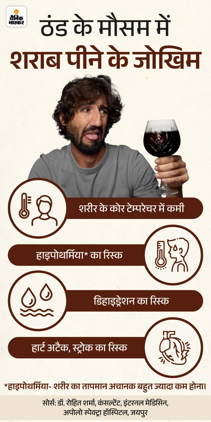 नेशनल इंस्टीट्यूट ऑन अल्कोहल एब्यूज एंड अल्कोहलिज्म (NIAAA) के मुताबिक, कोल्ड एनवायर्नमेंट में शराब पीने से हाइपोथर्मिया का रिस्क बढ़ता है। इसके कई और भी खतरे हैं। इसे नीचे दिए ग्राफिक से समझिए-