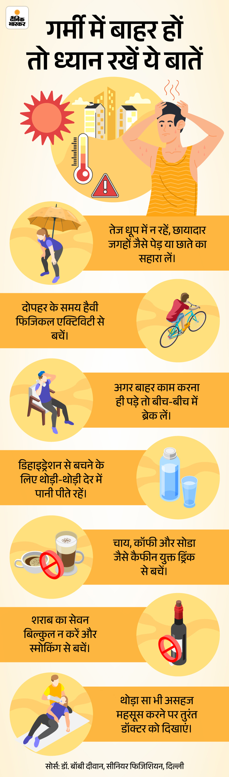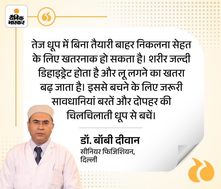 आंखों को नुकसानदायक अल्ट्रावायलेट (UV) किरणों से बचाने के लिए सनग्लासेज पहनें। अगर लंबे समय तक धूप में रहने वाले हैं तो ओरल रिहाइड्रेशन सॉल्यूशन (ORS) के कुछ पाउच भी साथ रखें। निकलने से पहले हल्का और सुपाच्य भोजन करें। दिन के सबसे गर्म समय यानी दोपहर 12-3 बजे के बीच बाहर निकलने से बचें। इसके अलावा कुछ और बातों का भी ध्यान रखें। इसे नीचे दिए ग्राफिक से समझिए-