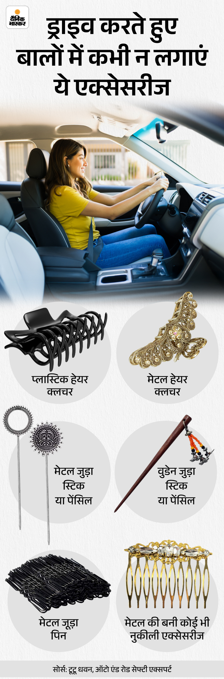 सवाल- ड्राइव करते हुए बालों में कौन सी एक्सेसरीज नहीं लगानी चाहिए? जवाब- ड्राइविंग के दौरान बालों में प्लास्टिक या मेटल की एक्सेसरीज लगाने से बचना चाहिए। इसके अलावा कुछ अन्य एक्सेसरीज भी गंभीर हादसे का कारण बन सकती हैं। इसे नीचे दिए ग्राफिक से समझिए-