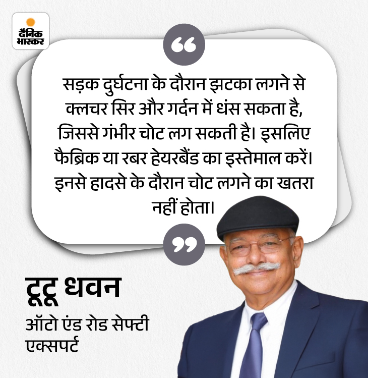सवाल- बालों में क्लचर लगाकर ड्राइविंग करना क्यों खतरनाक हो सकता है? जवाब- बालों में लगाने वाला क्लचर प्लास्टिक और मेटल जैसी मजबूत चीजों से बना होता है। इसके अलावा कुछ लकड़ी और बांस के हैंडमेड डिजाइन के क्लचर भी आते हैं। यह सड़क दुर्घटना के समय सिर के साथ-साथ गर्दन में चुभ सकते हैं, जिससे गंभीर चोट लग सकती है।