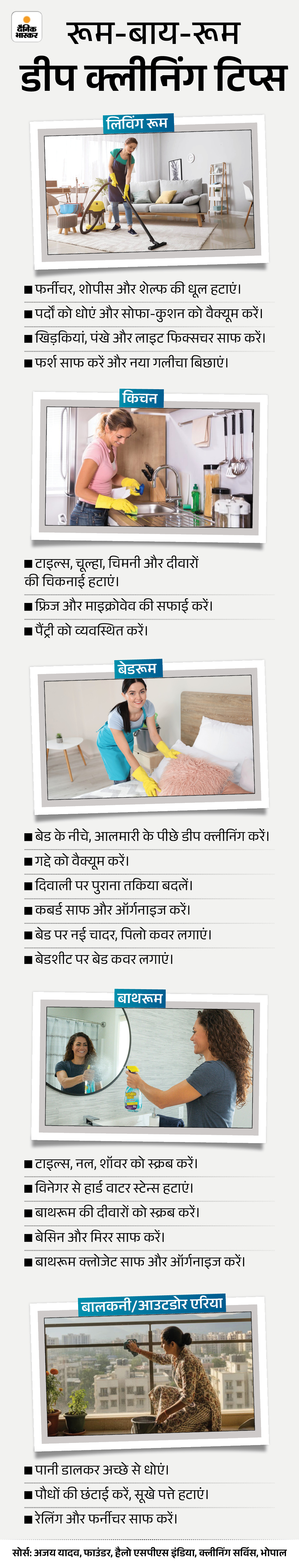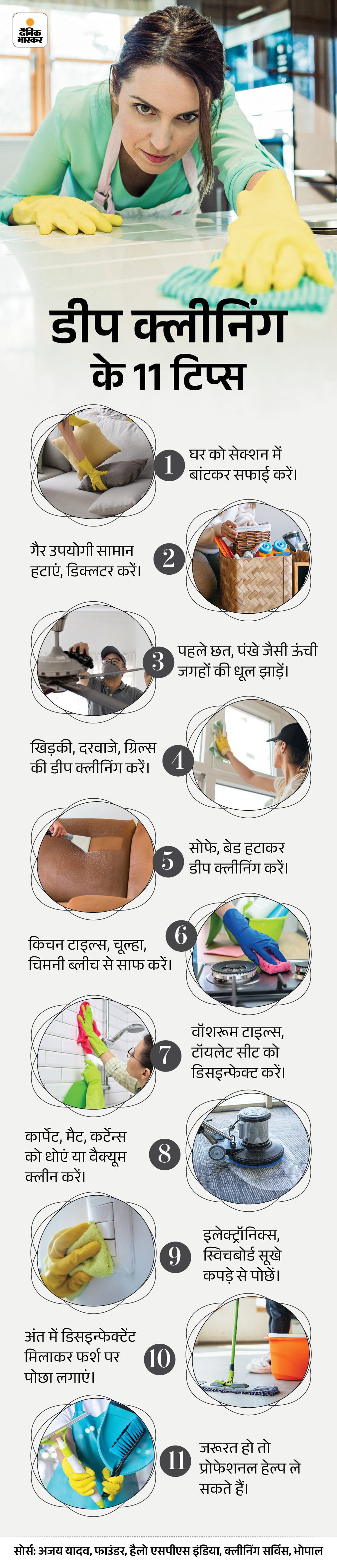सफाई को 2-3 हफ्ते पहले शुरू करें ताकि आखिरी समय में हड़बड़ी न हो। इसमें परिवार के सभी सदस्यों को शामिल करें ताकि काम आसान और मजेदार हो जाए। साथ ही जरूरी सामान जैसे झाड़ू, पोछा, वैक्यूम क्लीनर, ग्लव्स और नेचुरल क्लीनर (जैसे विनगेर और नींबू) पहले से तैयार रखें। नीचे दिए गए ग्राफिक से डीप क्लीनिंग के 10 जरूरी टिप्स समझिए-