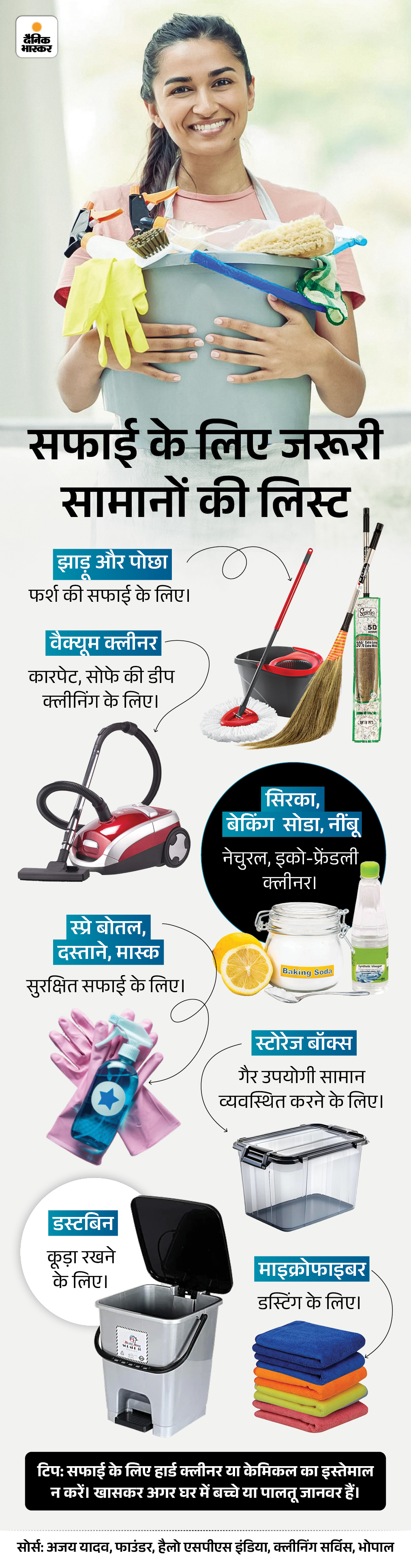 जवाब- घर की डीप क्लीनिंग के लिए कुछ खास सामानों की जरूरत होती है। इसे नीचे दिए ग्राफिक से समझिए-
