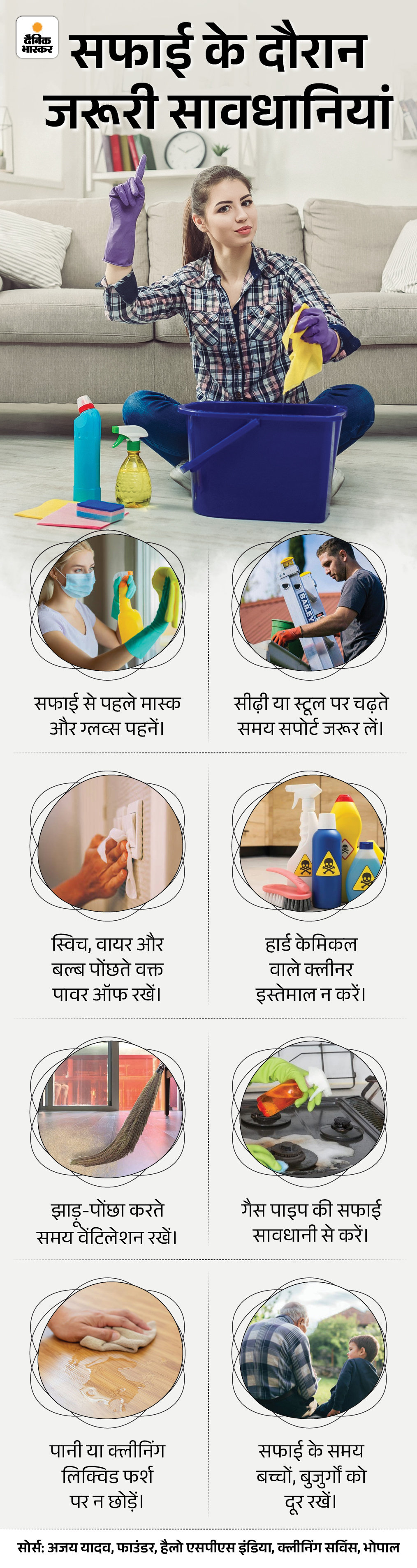 जवाब- दिवाली पर सफाई के समय लापरवाही से कई तरह की परेशानियों का सामना करना पड़ता है। इसलिए इस दौरान कुछ बातों का ध्यान रखें। इसे नीचे दिए ग्राफिक से समझिए-