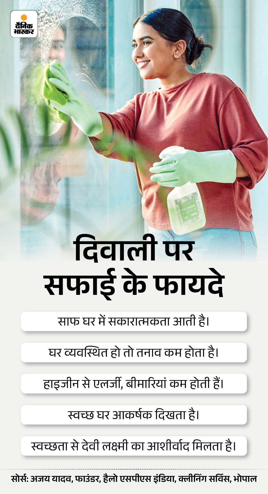 इसके अलावा स्वच्छ और व्यवस्थित घर में रहने से तनाव कम होता है। साथ ही ध्यान केंद्रित करने की क्षमता बढ़ती है। वहीं अव्यवस्थित घरों में रहने से स्ट्रेस, डिप्रेशन और थकान होती है। नीचे दिए ग्राफिक से दिवाली पर घर की सफाई के फायदे समझिए-