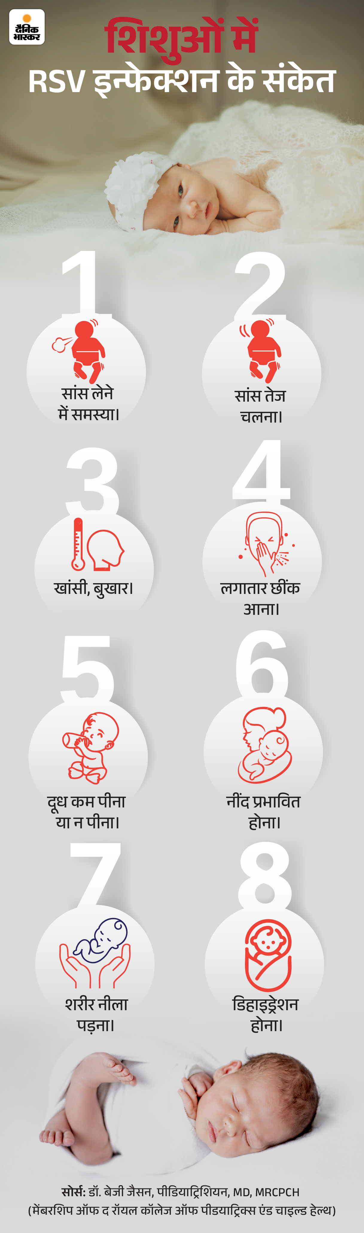 नवजात शिशुओं के लिए यह ज्यादा खतरनाक इसलिए है क्योंकि उनका इम्यून सिस्टम पूरी तरह विकसित नहीं होता, फेफड़े छोटे और नाजुक होते हैं और वे अपनी सांस की परेशानी ठीक से व्यक्त नहीं कर पाते हैं। ये आमतौर पर सितंबर से मार्च महीने के बीच में ज्यादा फैलता है। नीचे दिए ग्राफिक से शिशुओं में RSV इन्फेक्शन के मुख्य लक्षणों को समझिए-