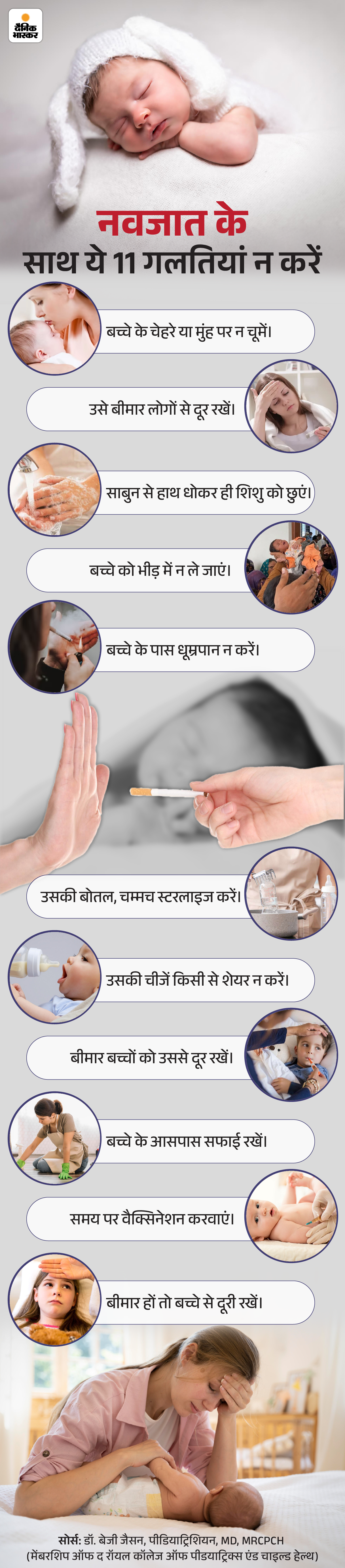 जवाब- अक्सर लोग न्यूबॉर्न बेबी के साथ कुछ ऐसे व्यवहार करते हैं, जिनसे जाने-अनजाने में RSV और अन्य इन्फेक्शंस का खतरा बढ़ता है। इसे नीचे दिए ग्राफिक से समझिए-