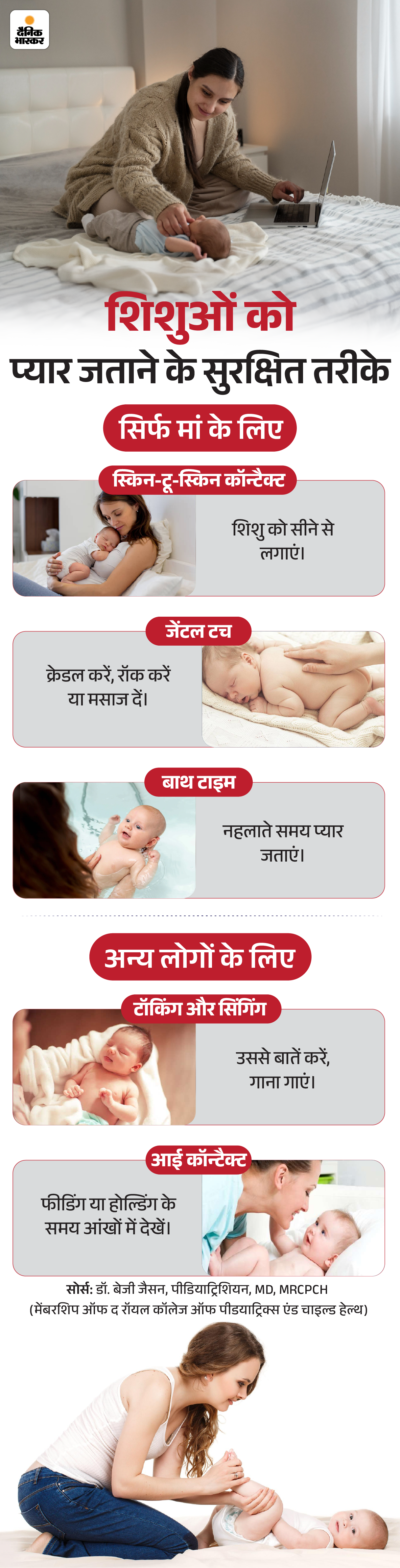 जवाब- शिशुओं को स्नेह दिखाने के कई सुरक्षित और प्यार भरे तरीके हैं, जो बॉन्डिंग बढ़ाते हैं। इसे नीचे दिए ग्राफिक से समझिए-