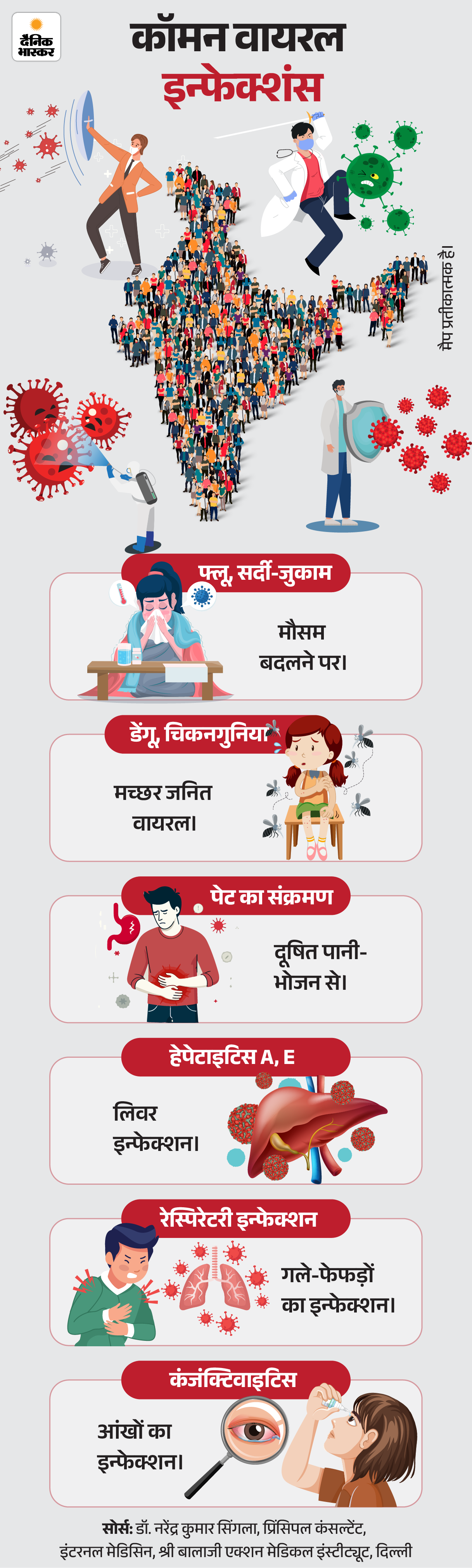 जवाब- यहां वायरल इन्फेक्शन की एक लंबी सूची है, जो मौसम, पर्यावरण और लाइफस्टाइल के अनुसार बदलती रहती है। हालांकि कुछ संक्रमण ऐसे हैं, जो हर साल बड़ी संख्या में लोगों को प्रभावित करते हैं। इन्हें नीचे दिए गए ग्राफिक से समझिए-