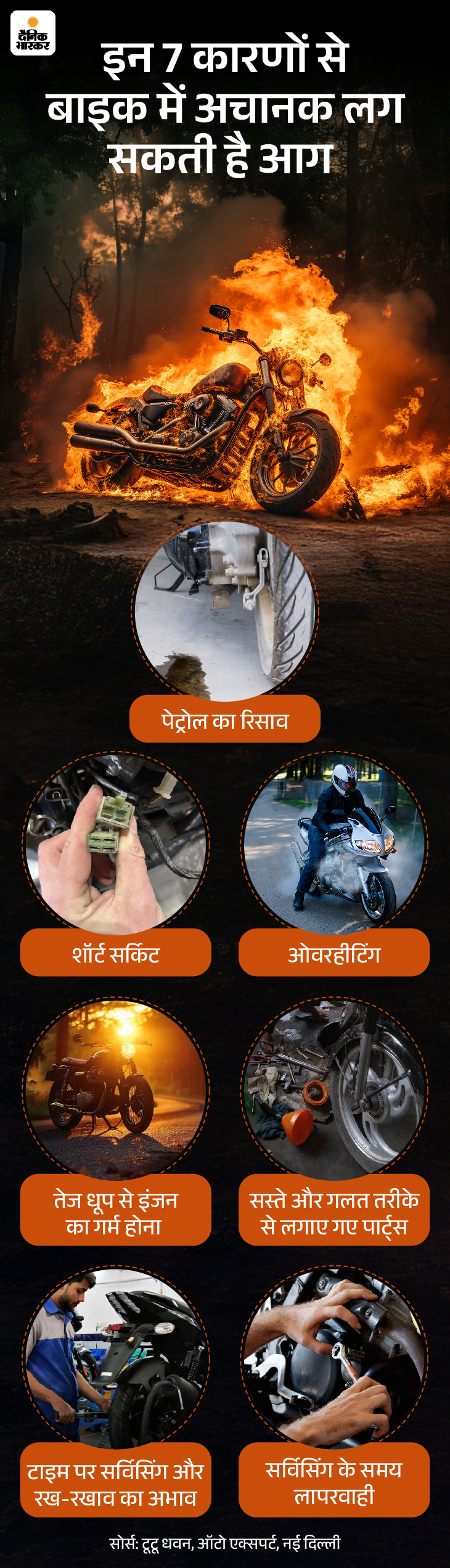 जवाब- अगर पेट्रोल टैंक या पाइप से पेट्रोल लीक हो रही है और बाइक की तारों में कोई खराबी हो तो छोटी सी चिंगारी भी आग लगा सकती है। गर्मी में पेट्रोल जल्दी उड़ता है, इसलिए आग लगने का खतरा ज्यादा रहता है।