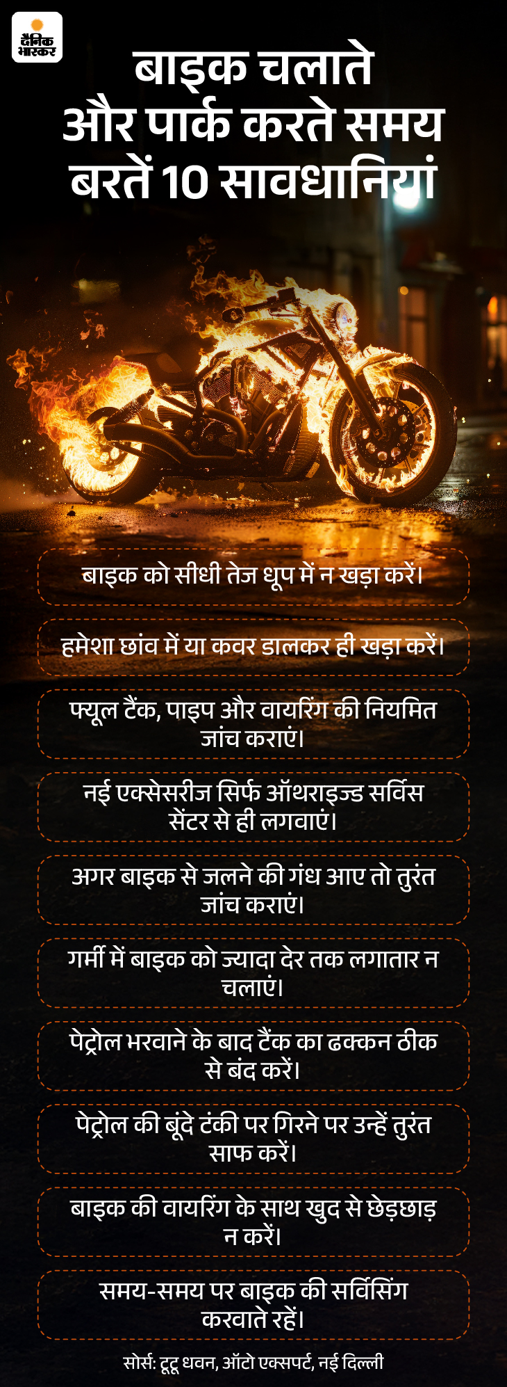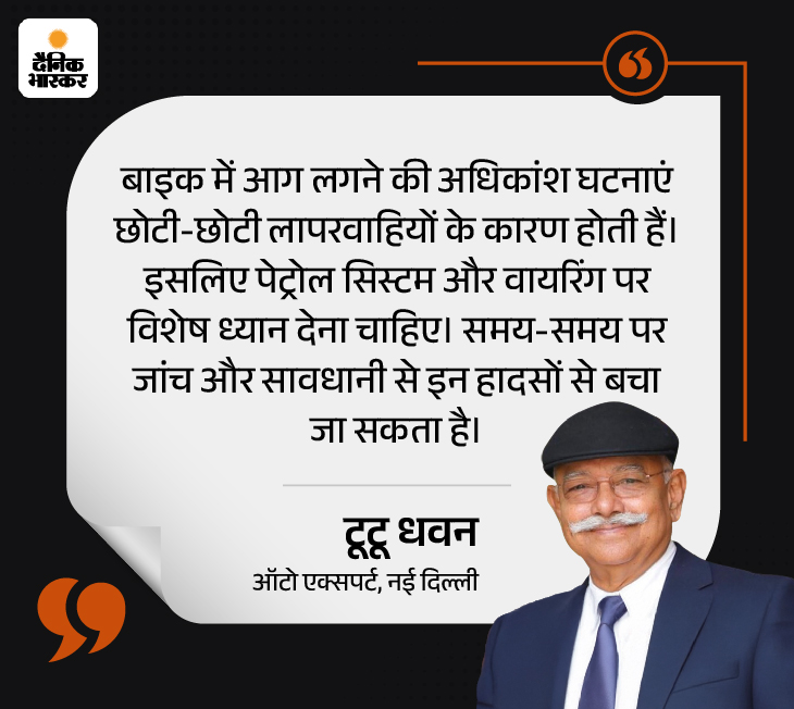 सवाल- बाइक में आग लगने की घटनाओं से बचने के लिए हम क्या सावधानियां अपना सकते हैं? जवाब- ऑटो एक्सपर्ट टूटू धवन बताते हैं कि गर्मी के मौसम में वाहन की अतिरिक्त देखभाल करनी चाहिए। सबसे पहले पेट्रोल टैंक और पाइप में किसी भी तरह की लीक न होने दें। साथ ही बाइक की वायरिंग और बैटरी की हालत नियमित रूप से जांचते रहें। सस्ते इलेक्ट्रिक पार्ट्स का इस्तेमाल करने से बचें क्योंकि ये खतरा बढ़ा सकते हैं। इसके अलावा तेज धूप में बाइक को लंबे समय तक खड़ा न रखें। नीचे ग्राफिक में कुछ और सावधानियां देख सकते हैं।