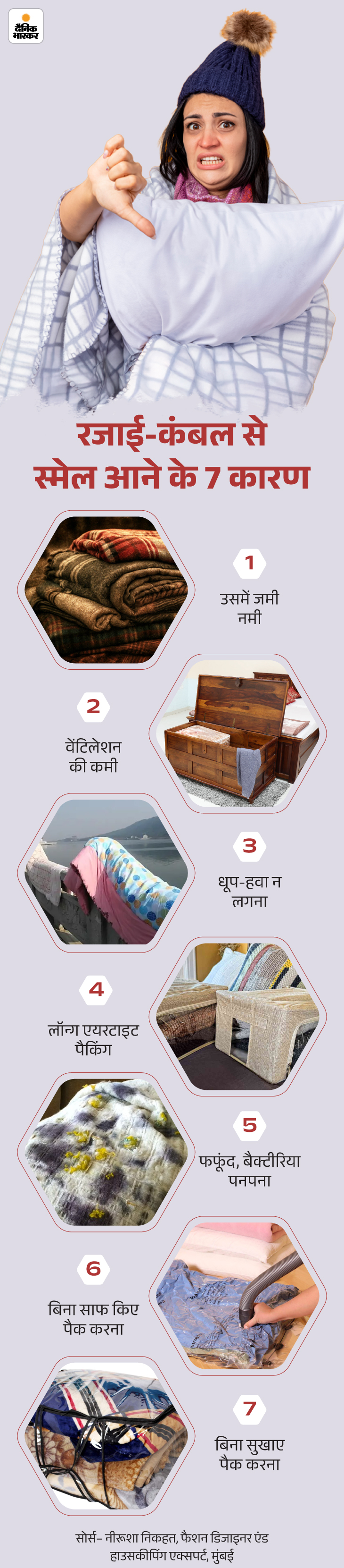 जवाब- रजाई-कंबल में स्मेल मुख्य रूप से लंबे स्टोरेज के दौरान फंसी नमी, धूल और फफूंदी की वजह से आती है। पैकिंग में हवा नहीं लगती, जिससे फफूंद, बैक्टीरिया पनपते हैं और मस्टीनैस (सीलन वाली स्मेल) पैदा होती है। नीचे दिए ग्राफिक से स्मेल के मुख्य कारणों को समझिए-