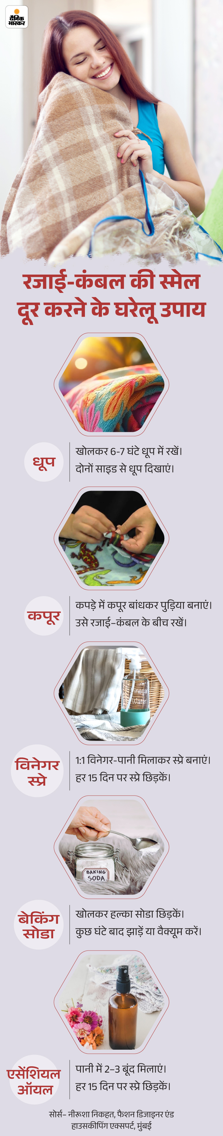 हालांकि कुछ नेचुरल तरीके भी हैं, जिनसे हम बहुत कम बजट में रजाई-कंबल को आसानी से रिफ्रेश कर सकते हैं। सुगंधित तेल, बेकिंग सोडा, व्हाइट विनेगर और कपूर के इस्तेमाल से स्मेल को सुरक्षित और किफायती तरीके से दूर किया जा सकता है। ये उपाय न सिर्फ रजाई-कंबल को रिफ्रेश करते हैं बल्कि फैब्रिक्स की सुरक्षा भी करते हैं।