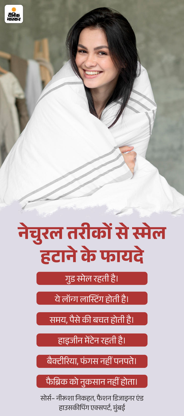 जवाब- इसका सबसे बड़ा फायदा है कि ये तरीके सस्ते और आसान हैं, जिससे समय और पैसे की बचत होती है। धूप से बैक्टीरिया मरते हैं, जिससे बिस्तर हाइजीनिक रहता है। कपूर और एसेंशियल ऑयल्स ताजगी देते हैं और घर को सुगंधित बनाते हैं। नीचे दिए ग्राफिक से इसके और फायदों को समझिए-