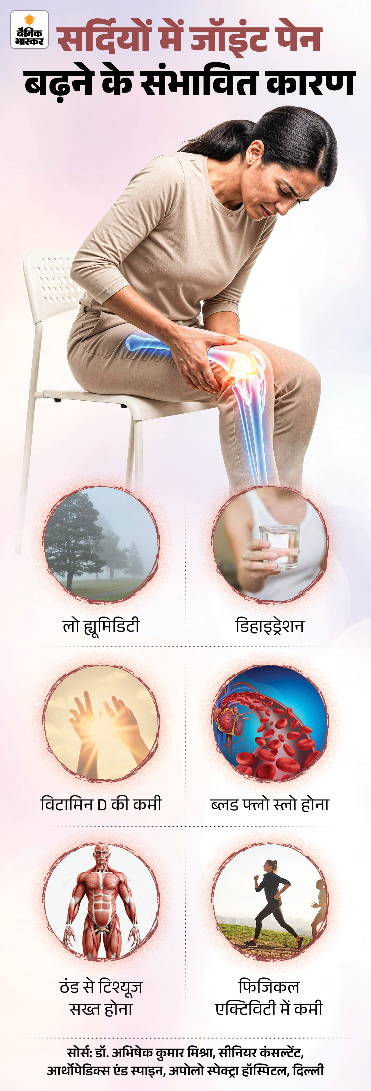 इसके अलावा ठंड में लोग फिजिकली कम एक्टिव रहते हैं, जिससे जॉइंट्स की मूवमेंट कम हो जाती है। इससे भी दर्द बढ़ता है। नीचे दिए ग्राफिक से सर्दियों में जॉइंट पेन के संभावित कारणों को समझिए-