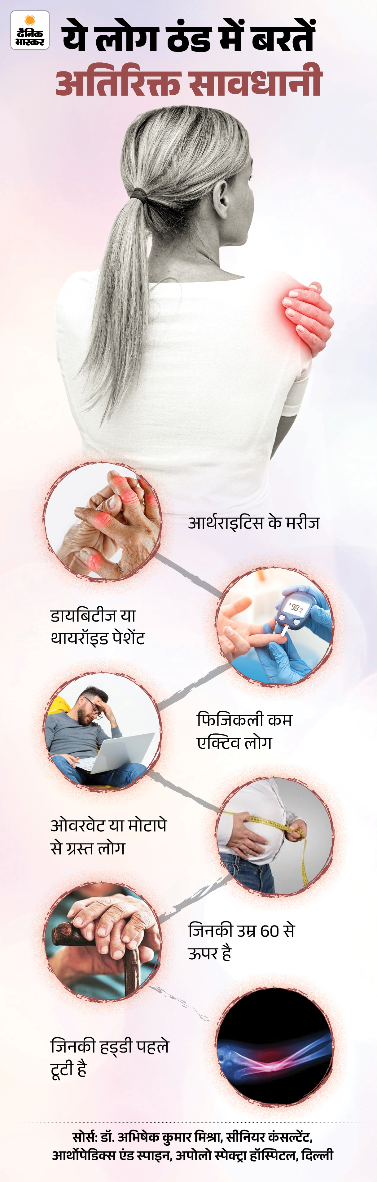 ठंड में मांसपेशियां ठंडी होकर टाइट हो जाती हैं। इससे जोड़ों पर अधिक दबाव पड़ता है और दर्द बढ़ जाता है। जिन लोगों को ऑस्टियोआर्थराइटिस, रूमेटॉइड आर्थराइटिस या सर्वाइकल स्पॉन्डिलाइटिस की समस्या होती है, उनमें ठंड के दिनों में लक्षण ज्यादा बढ़ जाते हैं।