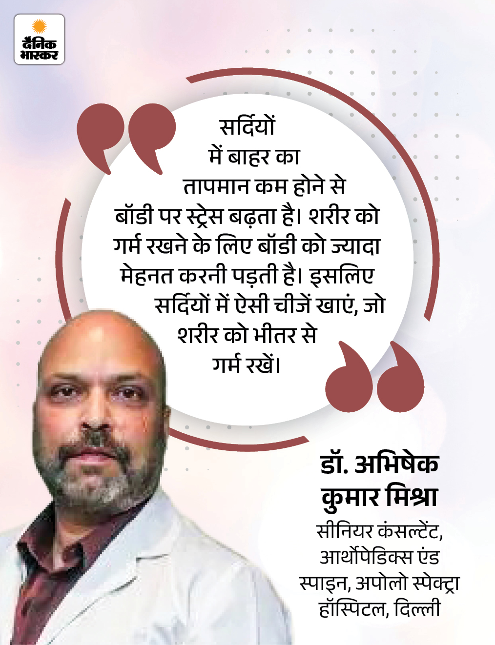 जवाब- ठंड में तापमान में कमी के कारण ब्लड वेसल्स सिकुड़ जाती हैं। इससे जोड़ों और मांसपेशियों तक ब्लड फ्लो कम पहुंचता है, जिसके कारण दर्द, जकड़न और भारीपन बढ़ने लगता है।