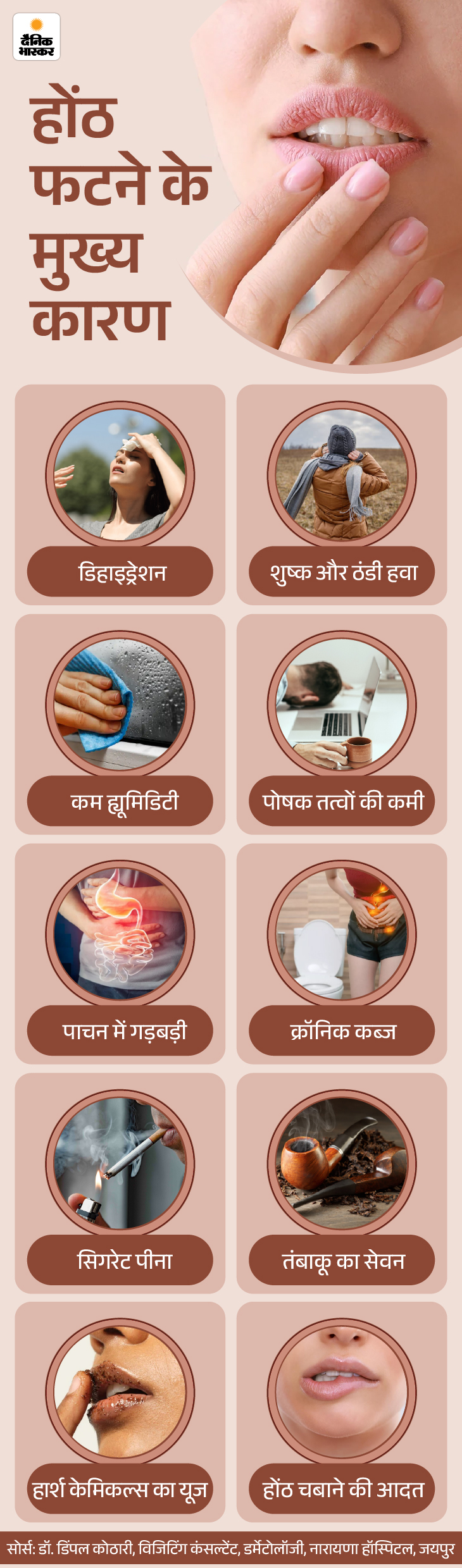 जवाब- इसके पीछे की मुख्य वजह होंठों की स्किन में मॉइश्चर की कमी है। दरअसल होंठों की स्किन में पसीने और ऑयल के ग्लैंड्स नहीं होते, इसलिए यह ड्राईनेस से बहुत जल्दी प्रभावित हो जाती है। नीचे दिए गए ग्राफिक से होंठ फटने के मुख्य कारणों को समझिए-