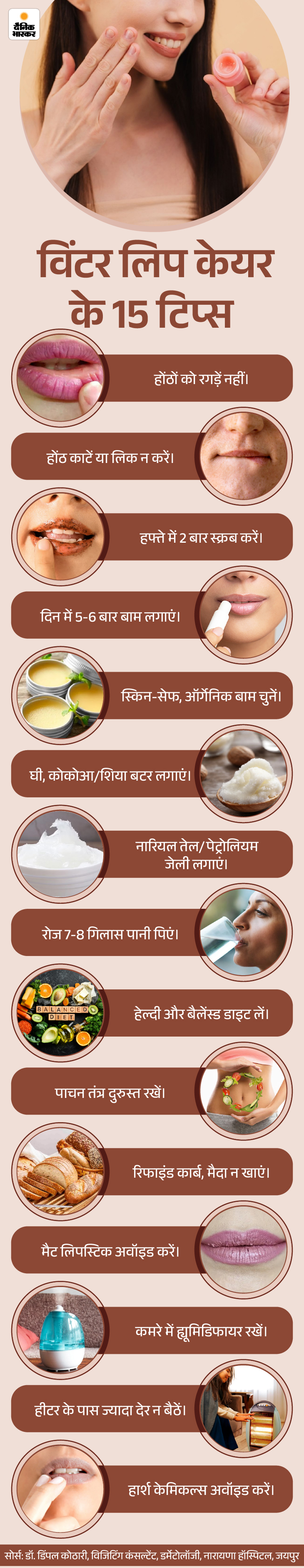 जवाब- होठों को हेल्दी रखने के लिए रेगुलर केयर की जरूरत होती है। इसके लिए कुछ बातों का खास ख्याल रखें। इसे नीचे दिए ग्राफिक से समझिए-