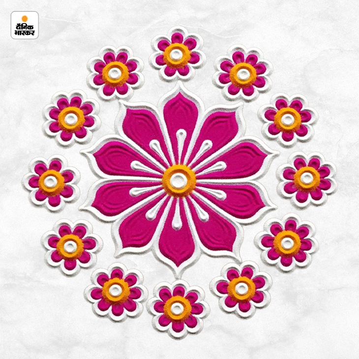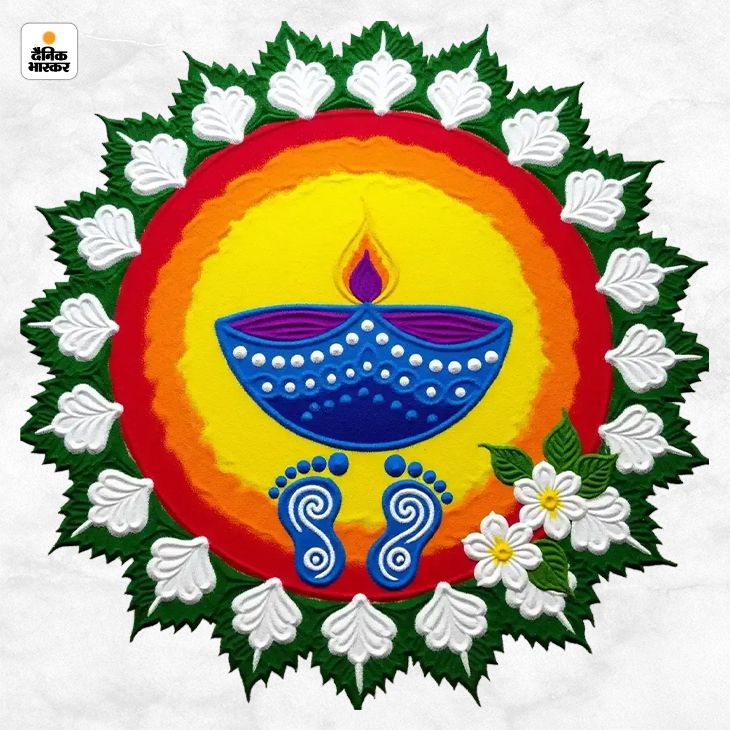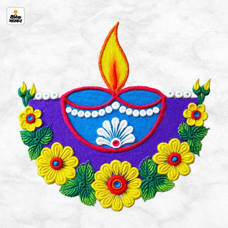 11. फूलों की खूशबू और दीये की रोशनी का संगम इस रंगोली में दिखता है। किनारों पर बने छोटे-छोटे फूल बीच में बने बड़े दीपक को और खूबसूरत बना देते हैं। यह डिजाइन न सिर्फ देखने में प्यारी है बल्कि दिवाली की असली भावना-रोशनी और शुभता को दर्शाती है।