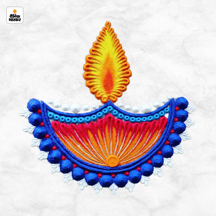 16. रंगोली की यह डिजाइन दिवाली थीम पर है। इसमें बड़ा सा दीपक बनाया गया है। इसमें इस तरह रंग भरे गए हैं कि लग रहा है जैसे दीपक जल रहा है। आसपास और सुंदर रंग भी भरे गए हैं।