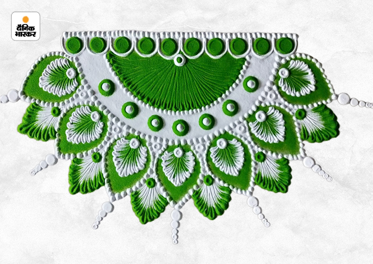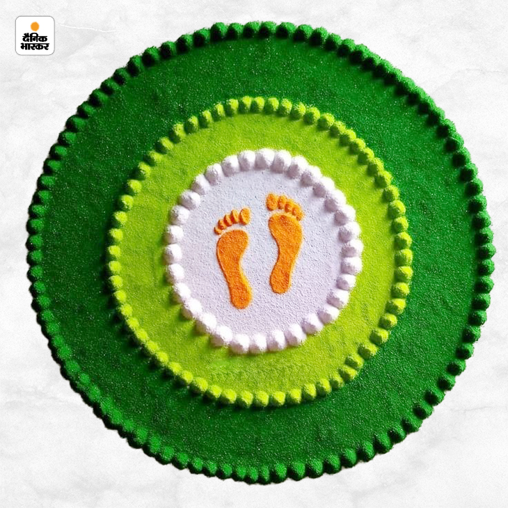 20. हरे और सफेद रंग की ये रंगोली कम मेहनत और कम समय में बनकर तैयार हो जाएगी। इसमें बीच में बना हरे रंग का ये दीपक किनारे डिजाइन में रखे दीयों से खिल उठेगा। बीच में भगवान राम के पैरों की सुंदर आकृति है।