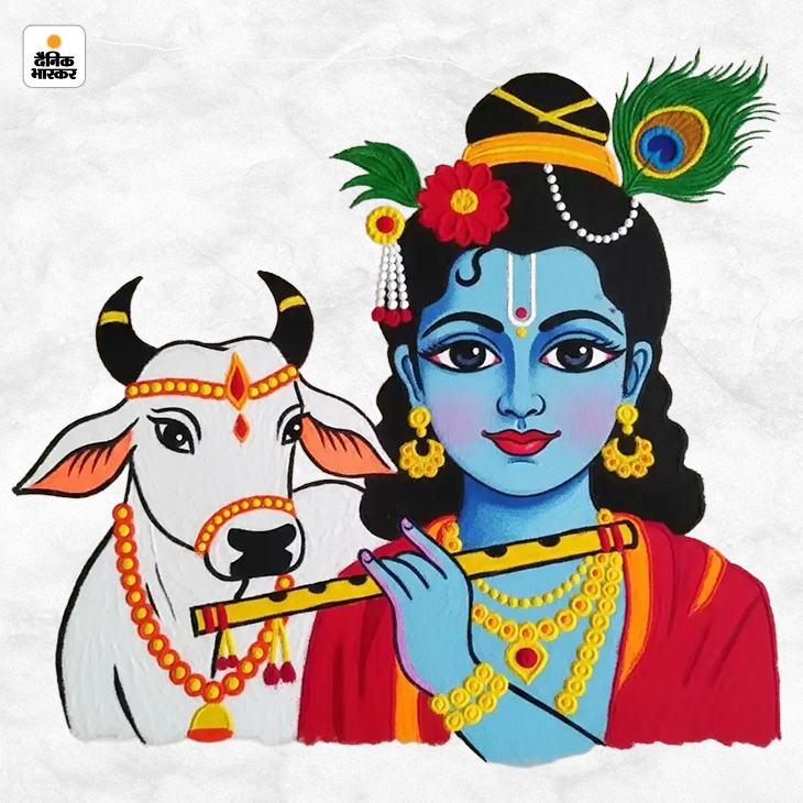 3. इस रंगोली में भगवान कृष्ण और गाय की सुंदर आकृति बनी है, जो एक सुकून भरा दृश्य पेश करती है। नीले और सफेद रंग के मेल से बनी यह डिजाइन भक्ति और शांति दोनों का एहसास कराती है।