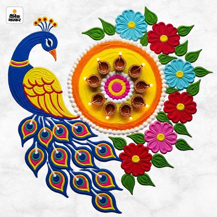 4. भारत में मोर बेहद शुभ माना जाता है। इसकी सुंदरता के तो क्या ही कहने। अगर आप रंगोली में मोर बनाएंगे तो ये सुंदर रंगों के साथ खिल उठेगी। बीच में घेरा बनाकर उसमें दीपक रख सकते हैं।