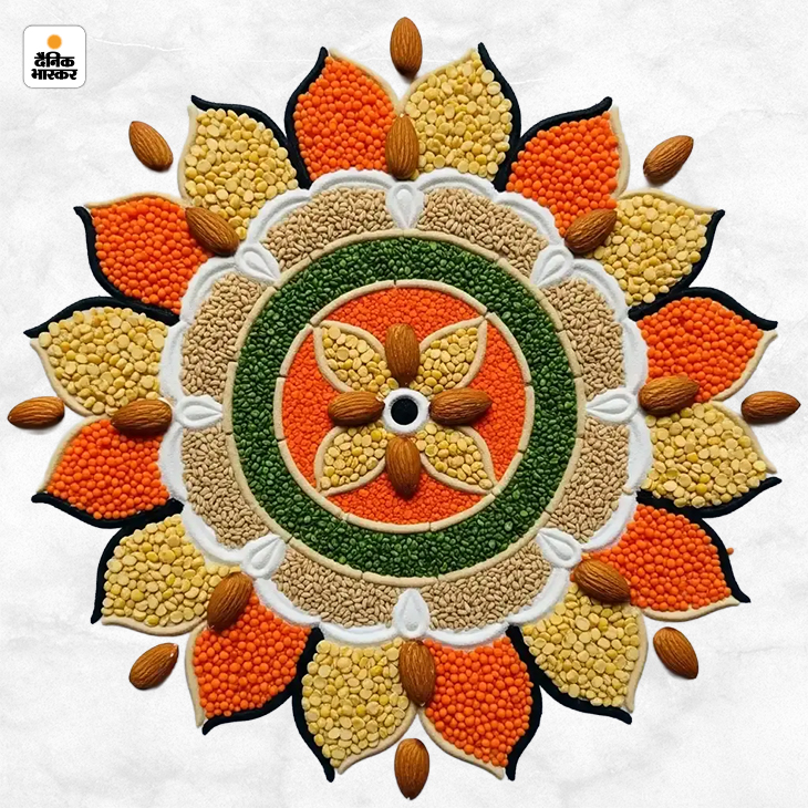 5. कुछ बादाम और दालों से बनी रंगोली बेहद सुंदर लगेगी। यह इको फ्रेंडली है और इसे देखकर हर किसी की नजरें रंगोली पर टिकी रह जाएंगी। इसके लिए बस किचन से 2-2 चम्मच मनपसंद रंग की दालें निकालनी हैं।