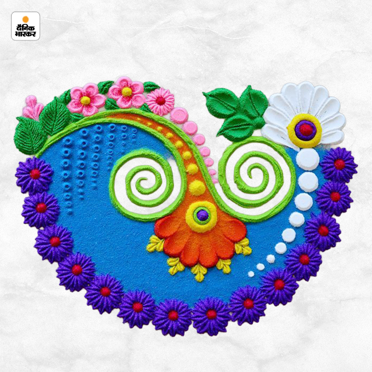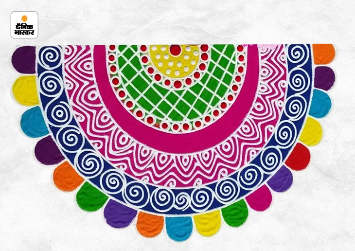 17. इन दिनों हाफ राउंड शेप वाली रंगोली खूब ट्रेंड में है। इसमें रंग और मेहनत दोनों कम खर्च होते हैं। यह देखने में भी ज्यादा सुंदर और साफ-सुथरी दिखती है।