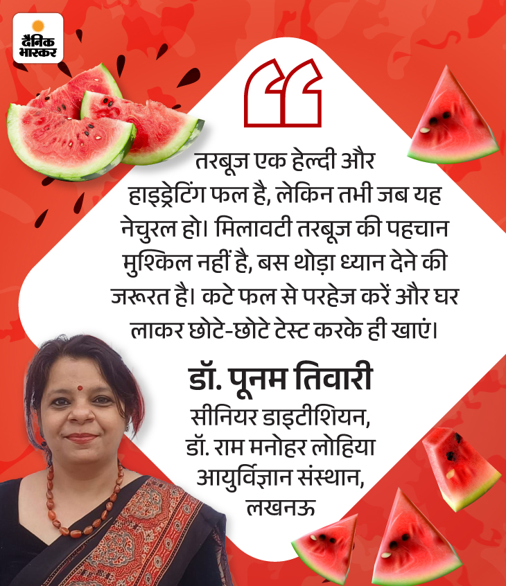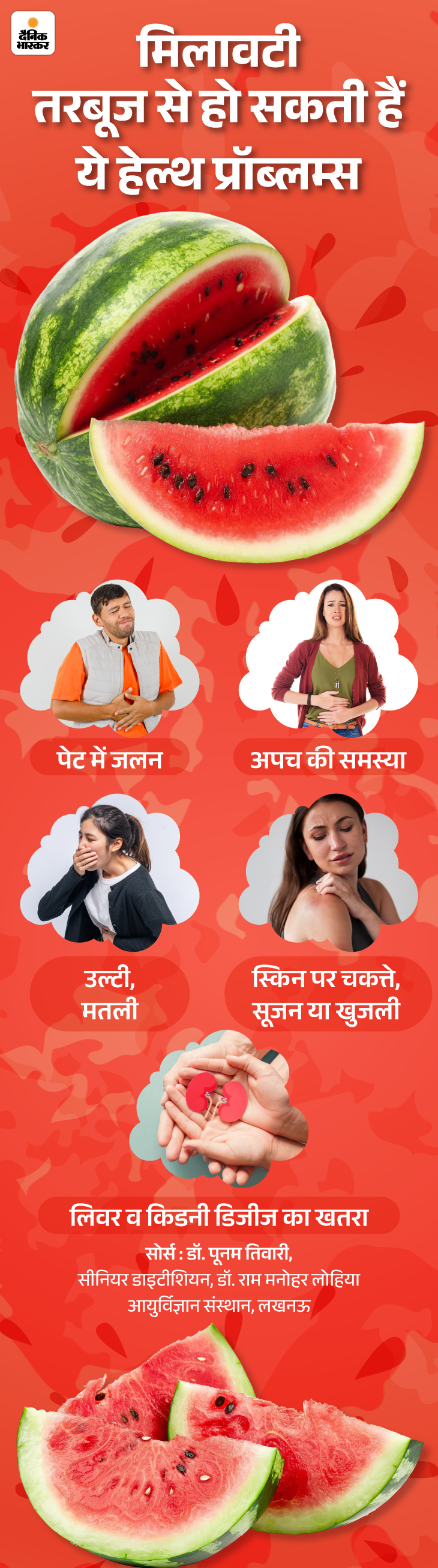 जवाब- सीनियर डाइटीशियन डॉ. पूनम तिवारी कहती हैं कि मिलावटी तरबूज खाने का असर जरूरी नहीं कि तुरंत दिखे। कुछ लोगों को खाते ही पेट में दर्द, उल्टी या खुजली जैसी दिक्कत हो सकती है, लेकिन ज्यादातर लोगों पर इसका लंबे समय में असर होता है।