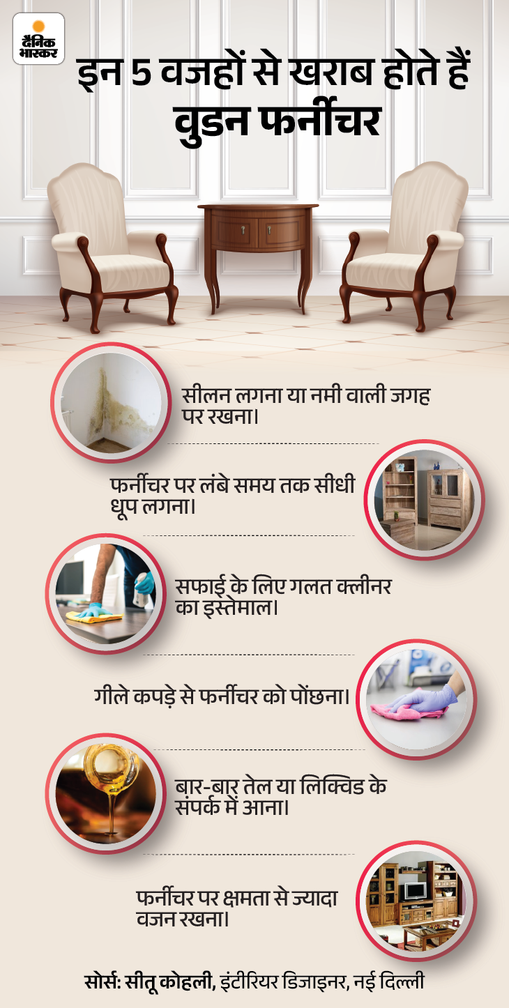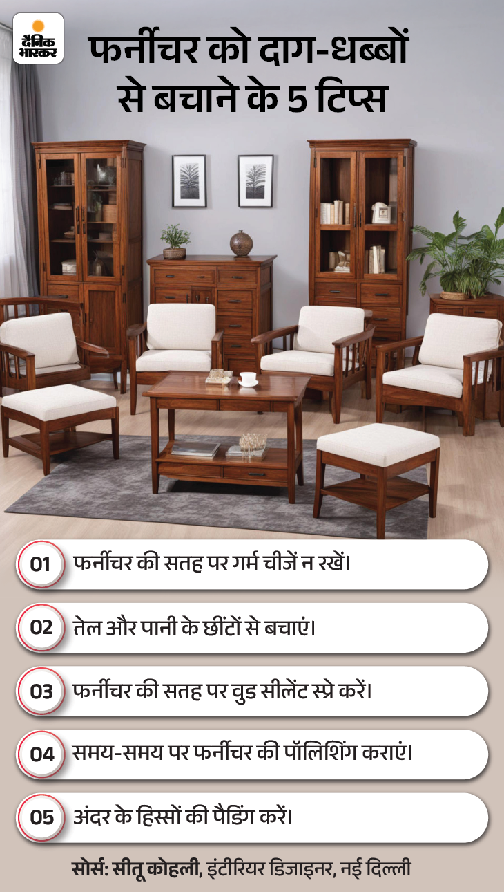 जवाब- लंबे समय तक फर्नीचर की खूबसूरती को बनाएं रखने के लिए हमें कुछ छोटी-छोटी चीजों को ध्यान में रखने की जरूरत है। आइए इसे ग्राफिक के जरिए समझते हैं।