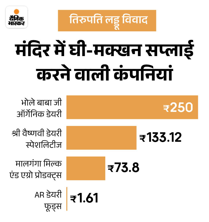TTD ने 2022 में शिकायतों के बाद भोले बाबा डेयरी को ब्लैकलिस्ट किया था। बाद में इसी ग्रुप ने दूसरी कंपनियों बनाईं और मंदिर में घी-मक्खन की सप्लाई जारी रही। इनमें वैष्णवी डेयरी (तिरुपति), माल गंगा डेयरी (उत्तर प्रदेश) और AR डेयरी फूड्स (तमिलनाडु) शामिल हैं।
